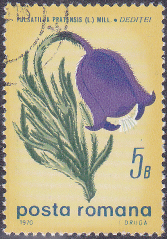 Auf einer Marke aus Rumänien (MiNr 2824) könne wir die Blüte einer Wiesen-Kuhschelle (Pulsatilla pratensis) sehen.