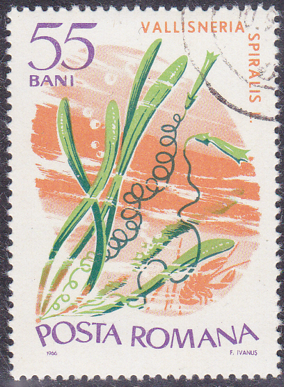 Auf einer Marke aus Rumänien (MiNr 2529) sehen wir eine Gewöhnliche Wasserschraube (Vallisneria spiralis).