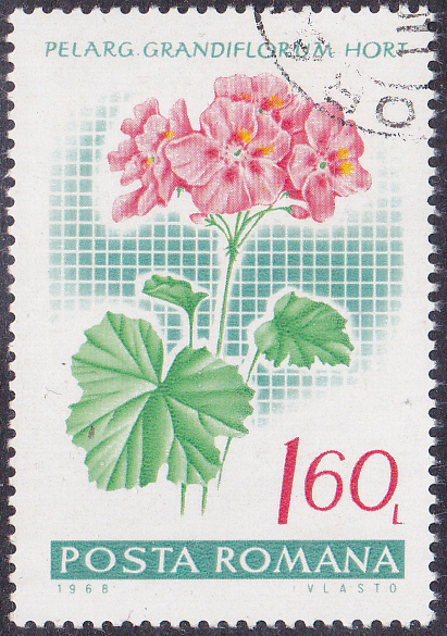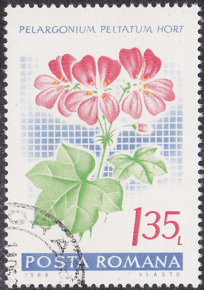 Diese marke aus Rumänien (MiNr 2269) zeigt Blüten einer Pelargonium odoratissimum. Michel nennt als Name Zitronen-Pelargonie (Pelargonium odoratissimum).