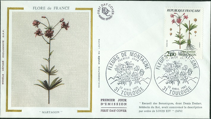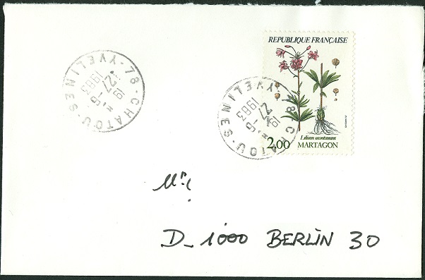Auf dieser Motiv-Marke der französischen Post kann man eine solche Türkenbund-Lilie sehen. Hier auf einem echt gelaufenen Brief nach Deutschland.
