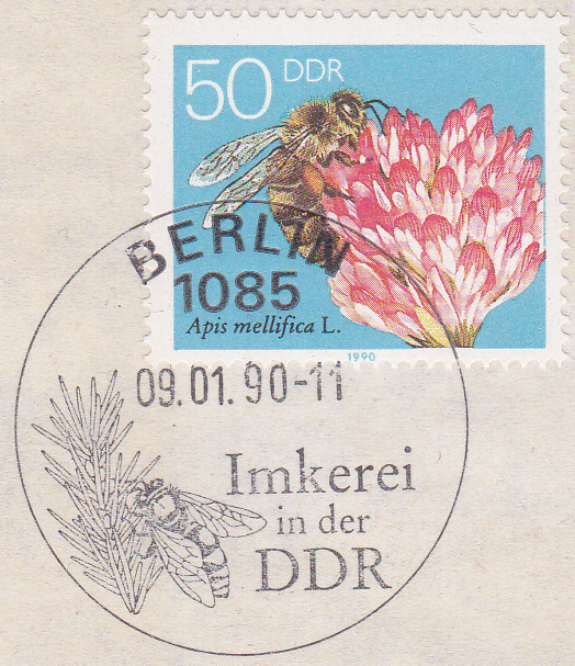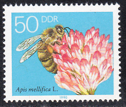 Diese Westliche Honigbiene (Apis mellifera) auf dieser Marke aus der DDR (MiNr 3298) besucht eine Rotkleeblüte.