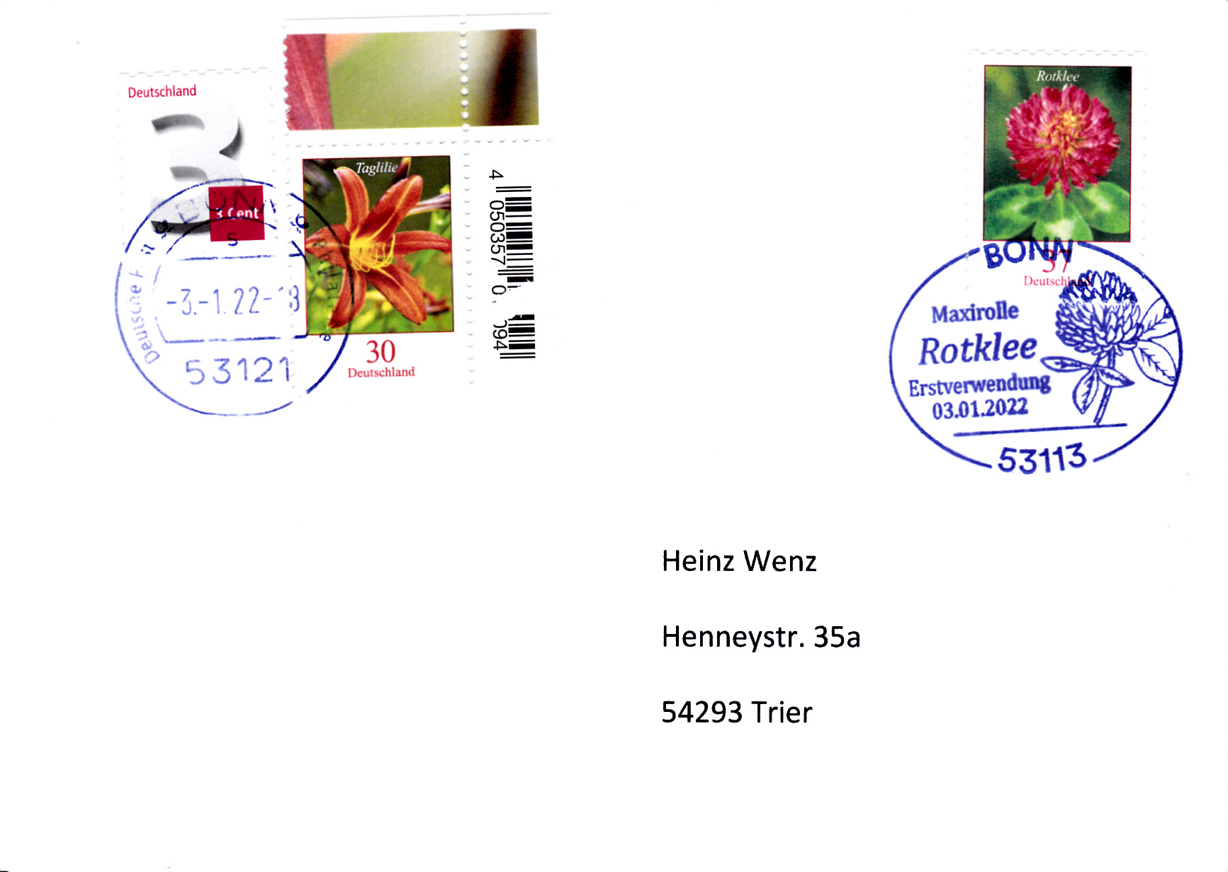 Für die selbstklebende Marke zu 37 Cent-Marke (MiNr 3662) gab es einen Erstverwendungsstempel mit dem Rotklee (Trifolium pratense) im Stempelbild. Die Blumenmarke auf dieser Karte ist mit dem Erstverwendungsstempel Bonn entwertet, die Zusatzfrankatur mit einem normalen Tagesstempel.