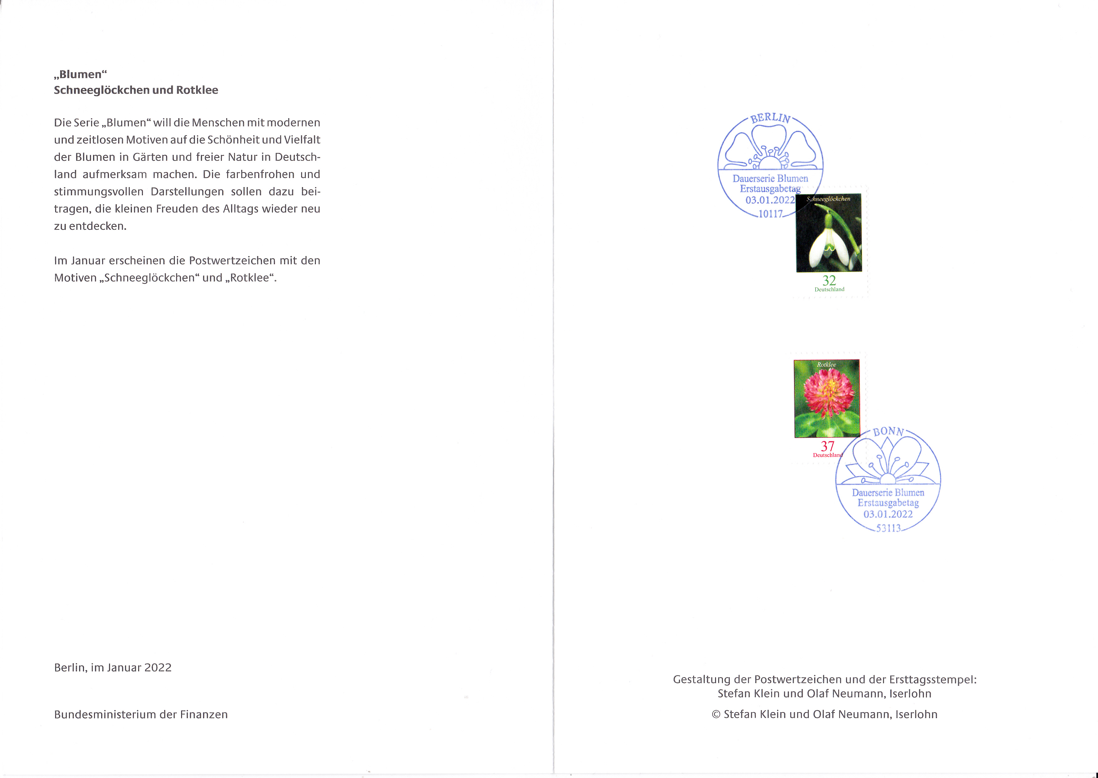 Ministerkarte des Bundesministers für Finanzen mit den beiden Marken der Dauerserie "Blumen" (MiNr 3655 und 3656) mit den Motiven Kleines Schneeglöckchen (Galanthus nivalis) und Rotklee (Trifolium pratense) und den beiden Ersttagsonderstempel Bonn und Berlin.