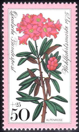 Auf einer Marke aus der Wohlfahrtsmarkenserie 1975 der Deutschen Bundespost (MiNr 869) wird ein Zweig einer Rostblättrige Alpenrose (Rhododendron ferrugineum) gezeigt.