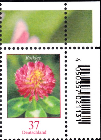 Am 3.2.2022 erschien in der Dauerserie "Blumen" der Deutschen Post die Marke zu 37 Cent (MiNr 3656) mit dem Motiv "Rotklee (Trifolium pratense)"