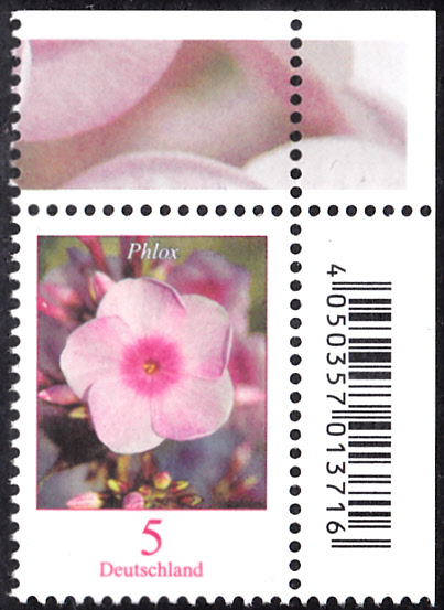 In der Dauerserie "Blumen" der Deutschen Post ist auch eine Marke mit einer Blüten einer Flammenblumen (Phlox sp.). Hier zeige ich eine Marke (MiNr 3296) aus dem Bogen als Eckrand mit EAN-Codierung.