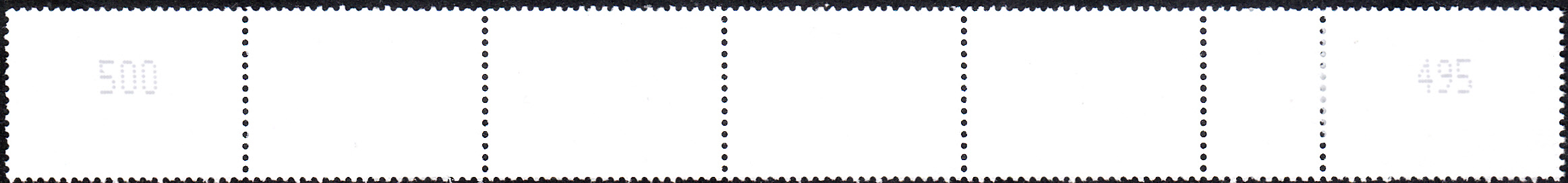 Hier zeige ich den Anfang einer 500er-Rolle mit dem 5 Cent Wert Phlox (MiNr 3296) mit den Marken mit der Nummer 500 und 495 sowie Zwischenfeld mit der EAN-Codierung.