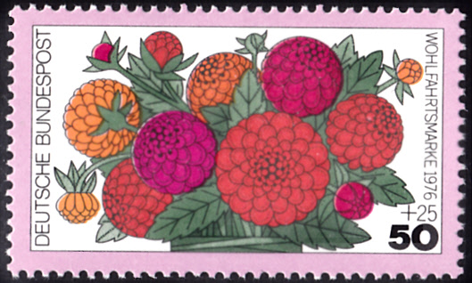 Einen Strauß aus Zinnien (Zinnia elegans) sehen wir auf dieser Marke der Deutschen Bundespost.