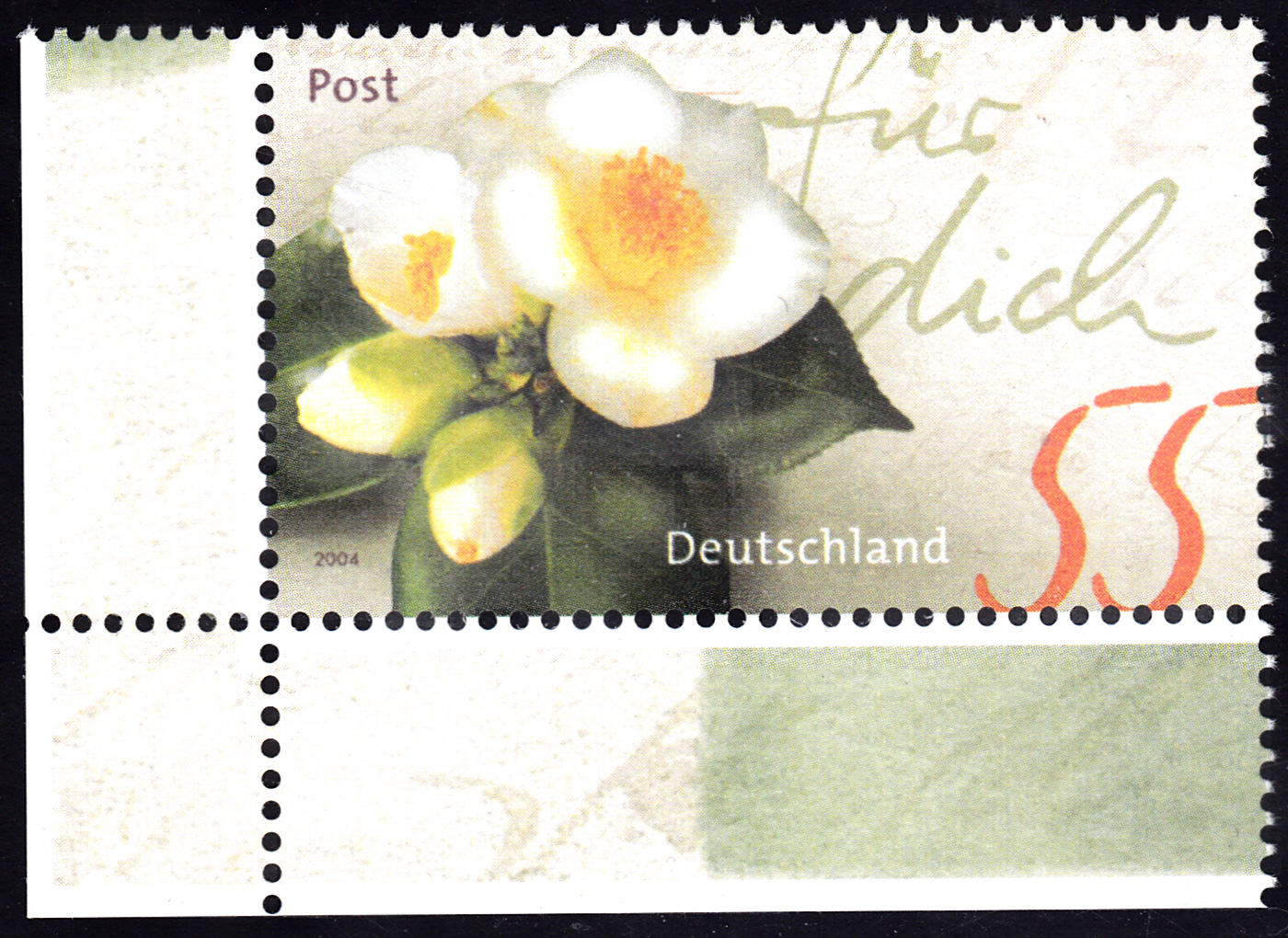 In der Serie "Post!" ist eine Marke "Kameliengruß" (MiNr 2414)mit der Abbildung einer blühenden Kamelie erschienen. Hier zeige ich eine Marke vom Eckrand.