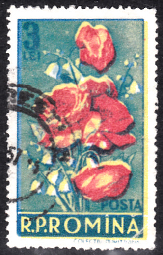Diese Marke aus Rumänien (MiNr 1592) zeigt Maiglöckchen (Convallaria majalis) und Blüten des Klatschmohns. Das Markenbild ist wegen einer Passerverschiebung nach rechts und etwas nach unten der Farbe Gelb leicht undeutlich.
