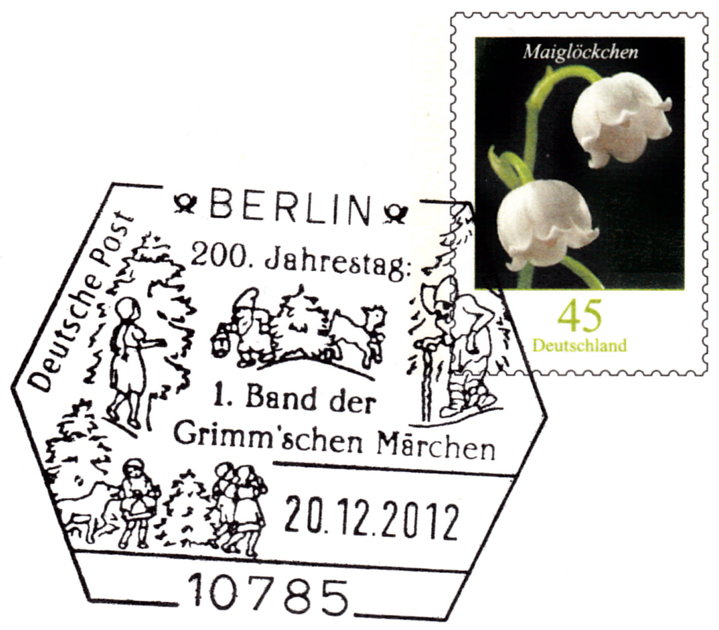 Es folgt eine sogenannten "Blanko-Postkarte" mit dem Wertstempel Maiglöckchen (MiNr P189) mit einem Zudruck zu "200 Jahre Grimms Märchen", die mit einem zum Zudruck passenden Sonderstempel gestempelt wurde.