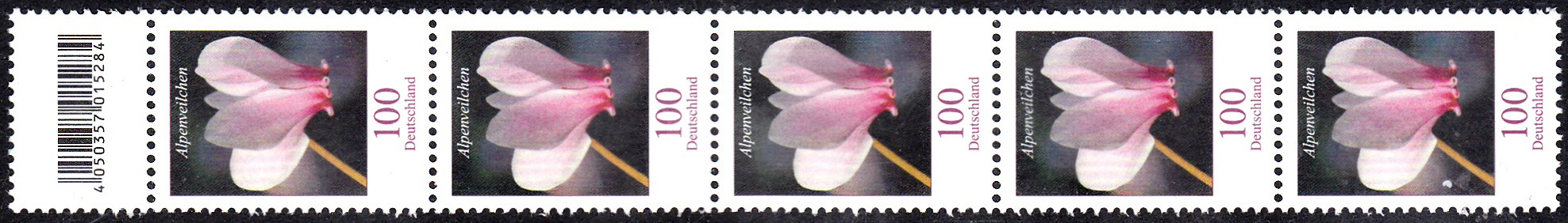 In der Dauerserie "Blumen" der Deutschen Post ist auch eine Marke (MiNr 3365) mit der Blüte eines Alpenveilchen (Cyclamen sp.) erschienen. Hier zeige ich ein Eckrandstück mit EAN-Code.