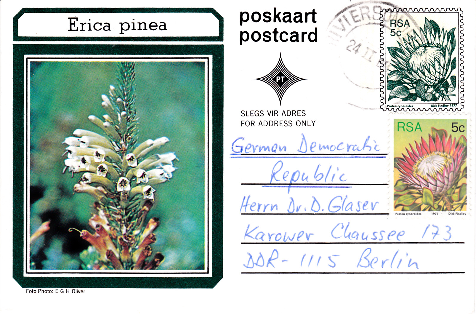 Diese Ganzsache, eine Postkarte aus Südafrika (= RSA) zeigt ein Foto einer Erica strigilifolia: