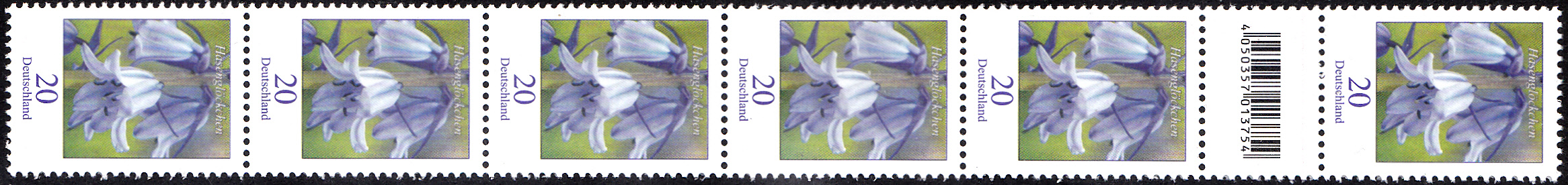 Die Marke zu 20 Cent aus der Serie "Blumen" mit dem Motiv "Atlantisches Hasenglöckchen (Hyacinthoides non-scripta)" (MiNr 3315) ist auch in 200er-Rollen erschienen. Hier ein Streifen von sechs Marken aus einer 200er-Rolle mit einem EAN-Code zwischen der 20. und 21. Marke. Der EAN-Code ist "4 050357 013754".
