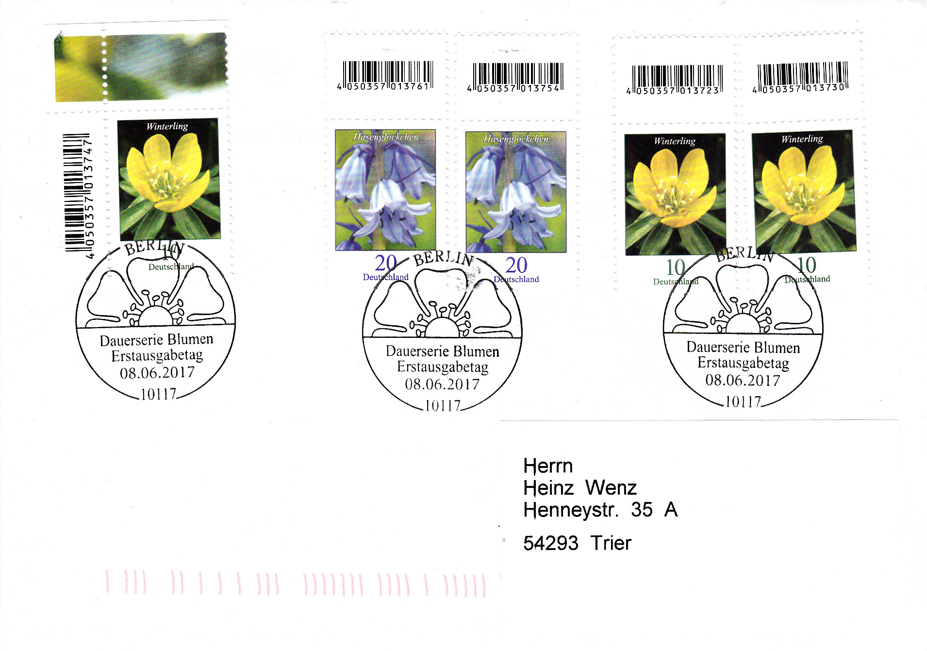 Auf diesem Brief wurden je eine Marke zu 10 Cent aus der Serie "Blumen" mit dem Motiv "Winterling (Eranthis hyemalis)" (MiNr 3314) aus dem Bogen, aus einer 200er-Rolle und aus einer 500er-Rolle sowie je eine Marke zu 20 Cent aus der Serie "Blumen" mit dem Motiv "Atlantisches Hasenglöckchen (Hyacinthoides non-scripta)" (MiNr 3315) aus der 200er-Rolle und aus der 500er-Rolle mit jeweils anhängendem EAN-Code verklebt und mit dem Ersttagsonderstempel Berlin entwertet.