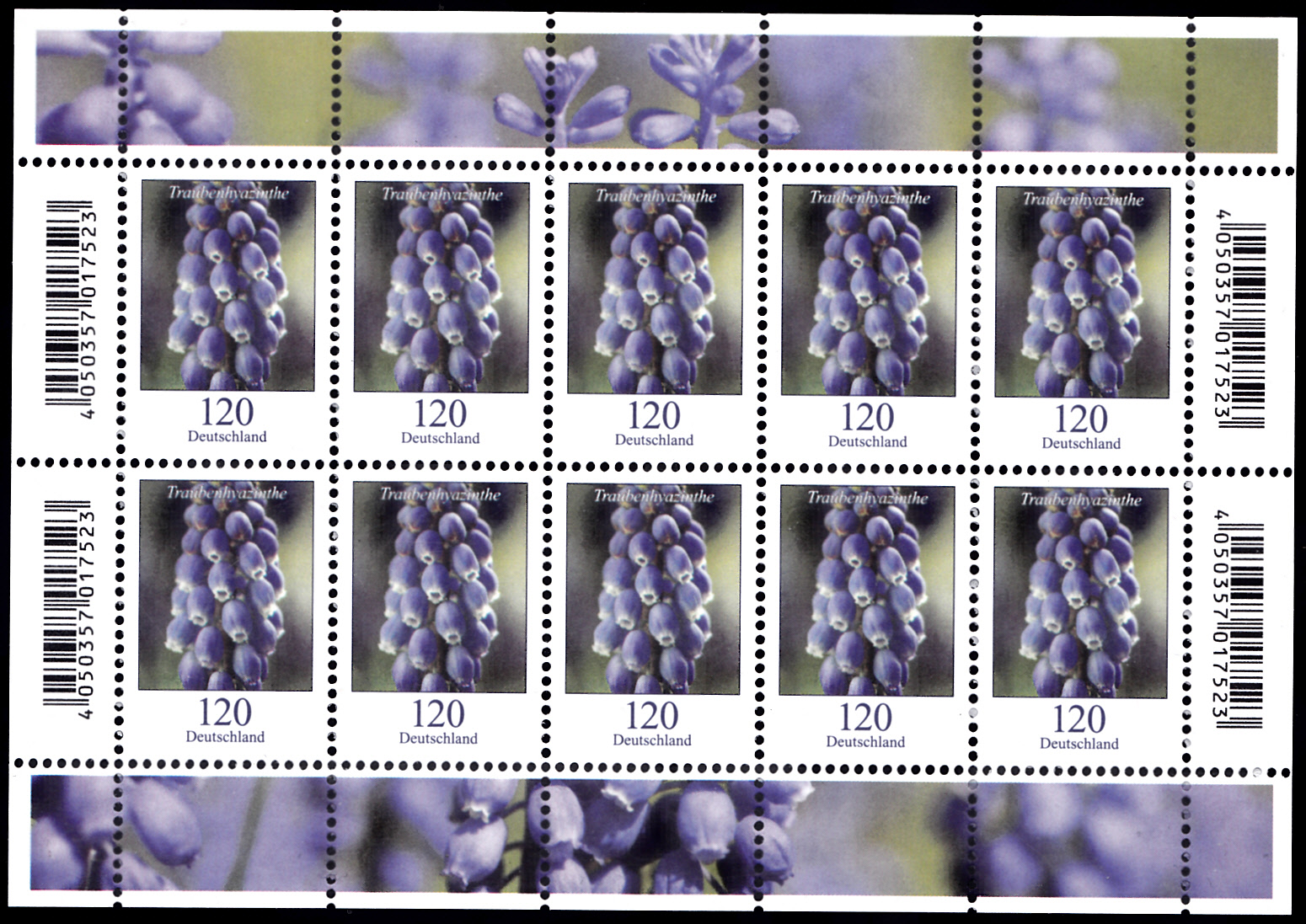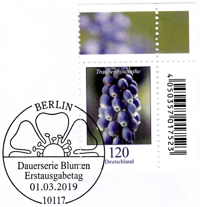 In der Dauerserie "Blumen" der Deutschen Post ist auch eine Marke (MiNr 3447) mit der Blüte einer Traubenhyazinthe (Muscari sp.) erschienen. Es handelt sich vermutlich um eine Zuchtform. Hier zeige ich ein Eckrandstück mit EAN-Code.