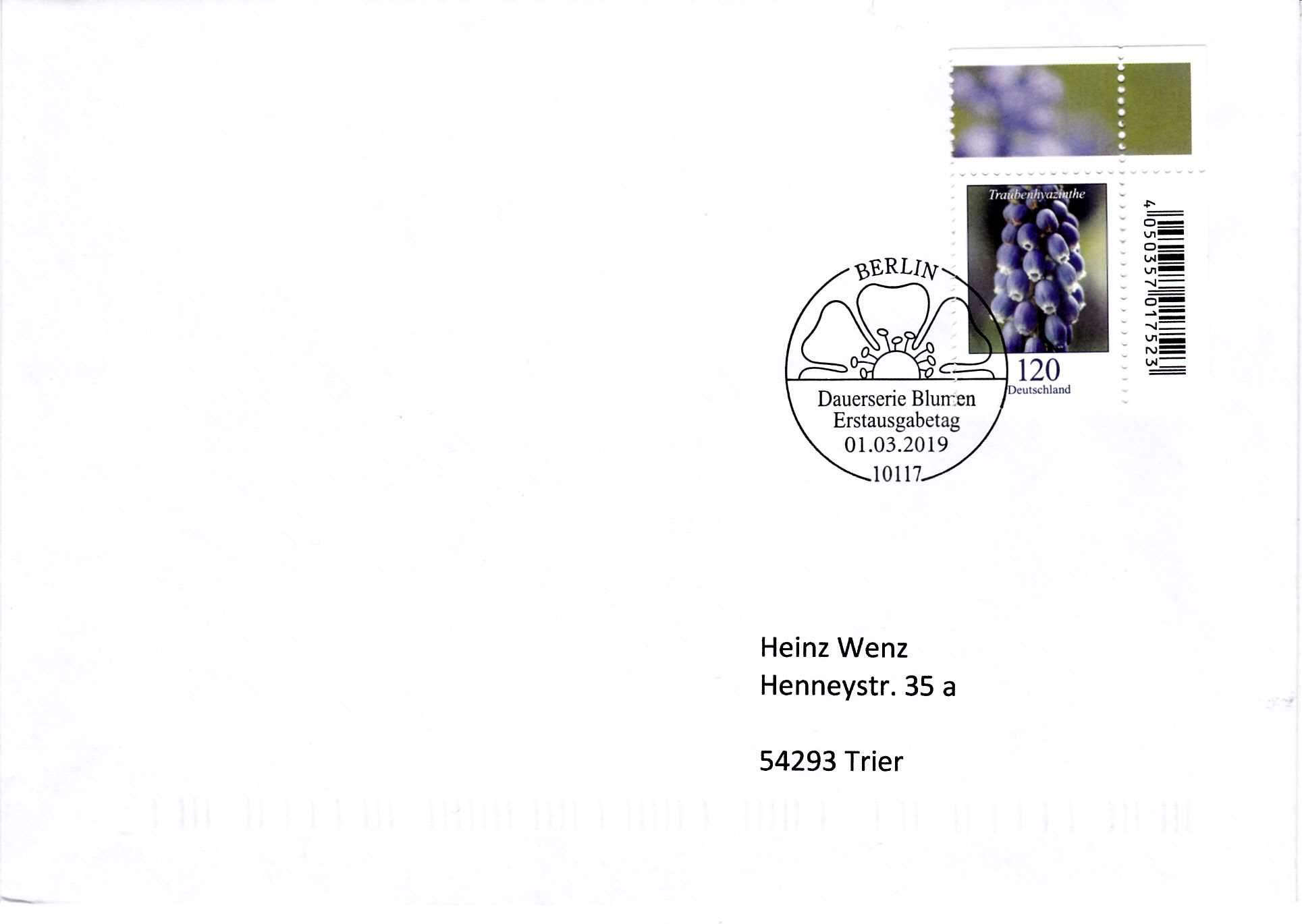 Klappkarte des Vorstandsvorsitzenden der Deutschen Post AG mit der Marke aus der Dauerserie "Blumen" zu 120 Cent (MiNr 3447) mit dem Motiv "Traubenhyazinthe (Muscari sp.)" und mit dem Ersttagsonderstempel Bonn.