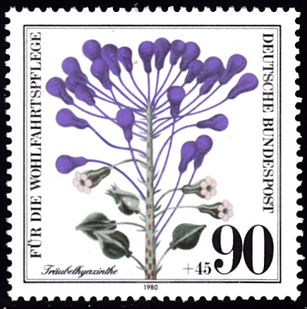 Auf dieser Marke der Deutschen Bundespost (MiNr 1062) sehen wir die Blüte einer Schopf-Traubenhyazinthe (Muscari comosum). Michel nennt sie Träubelhyazinthe (Muscari comosum).