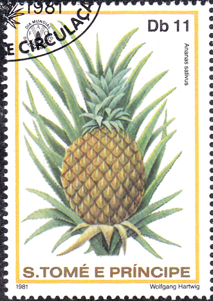 Diese Marke aus Sao Tomé und Principe (MiNr 744 A) bildet eine Frucht der Ananas ab.