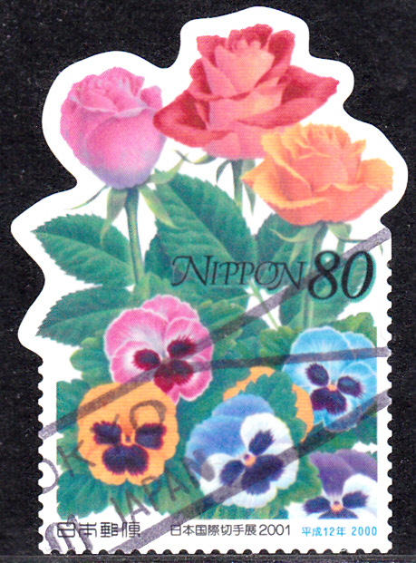Diese Marke aus Japan (MiNr 2948) aus einem Folienbogen zur Internationalen Briefmarkenausstellung PHILANIPPON ’01 bildet neben Rosen auch verschiedene Stiefmütterchen ab.