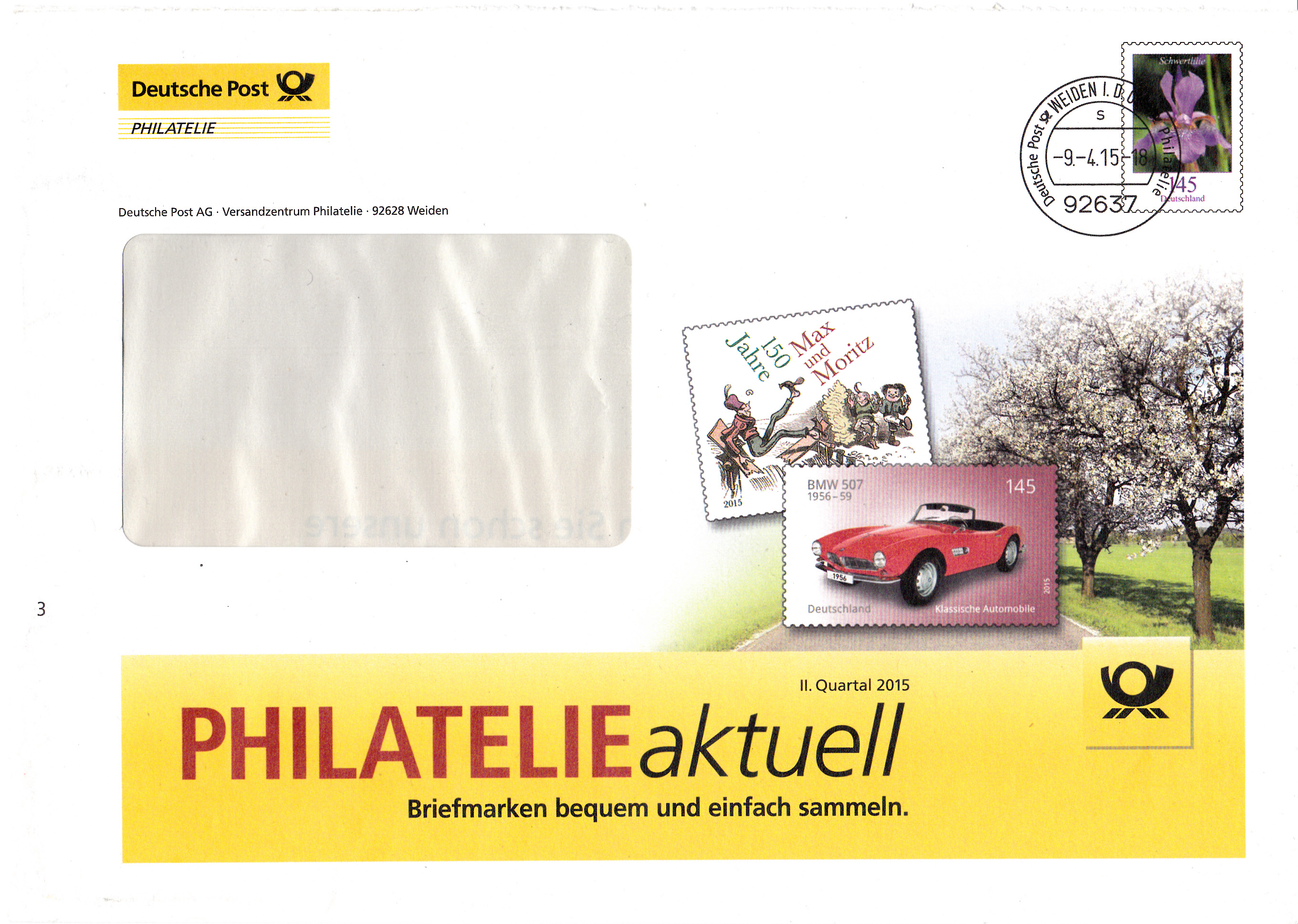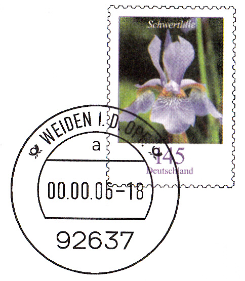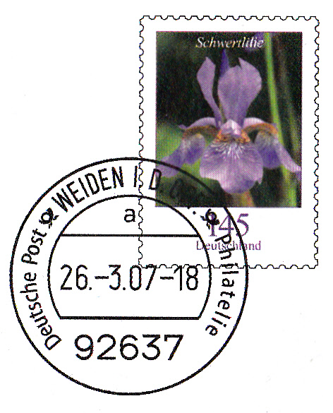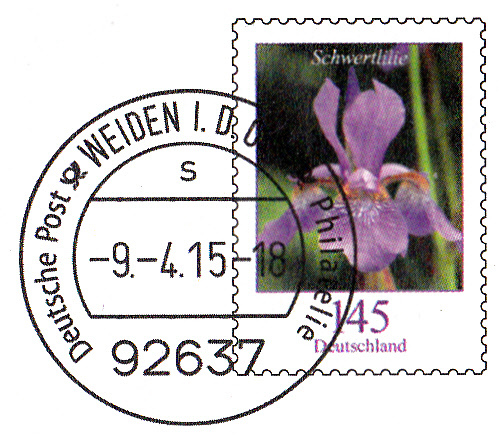 Dieser Ganzsachenumschlag im Format 229 x 162 mm hat einen Wertstempel mit der 145 Cent Marke "Schwertlilie" aus der Bauerserie "Blumen". Die Vorausentwertung hat das Datum "-9.-4.15-18". Es ist eine Eigenausgabe der Deutschen Post AG - Philatelie Weiden.