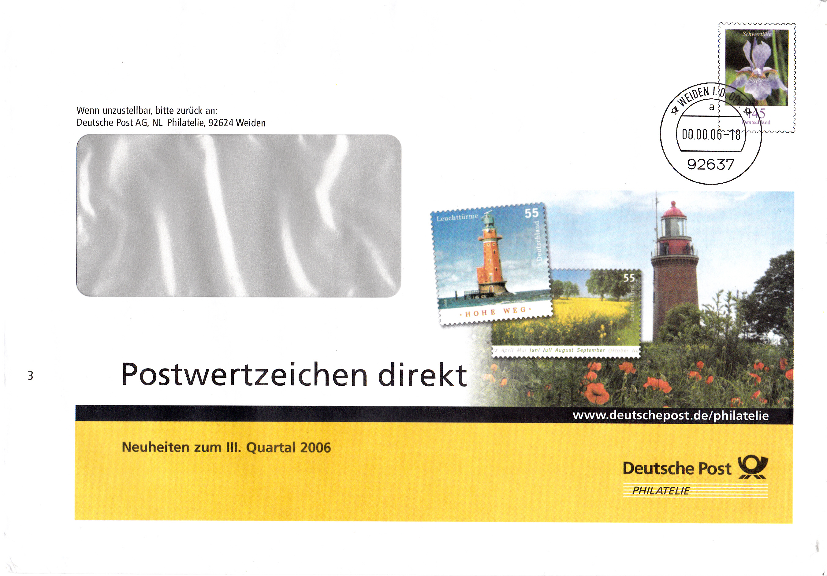 Dieser Ganzsachenumschlag (MiNr EA F 2436) im Format 229 x 162 mm, eine Eigenausgaben der Deutschen Post AG - Postlogo "Deutsche Post/Philatelie", hat einen Wertstempel mit der 145 Cent Marke "Schwertlilie" aus der Bauerserie "Blumen". Die Vorausentwertung hat das Datum "-8.-6.09-18".