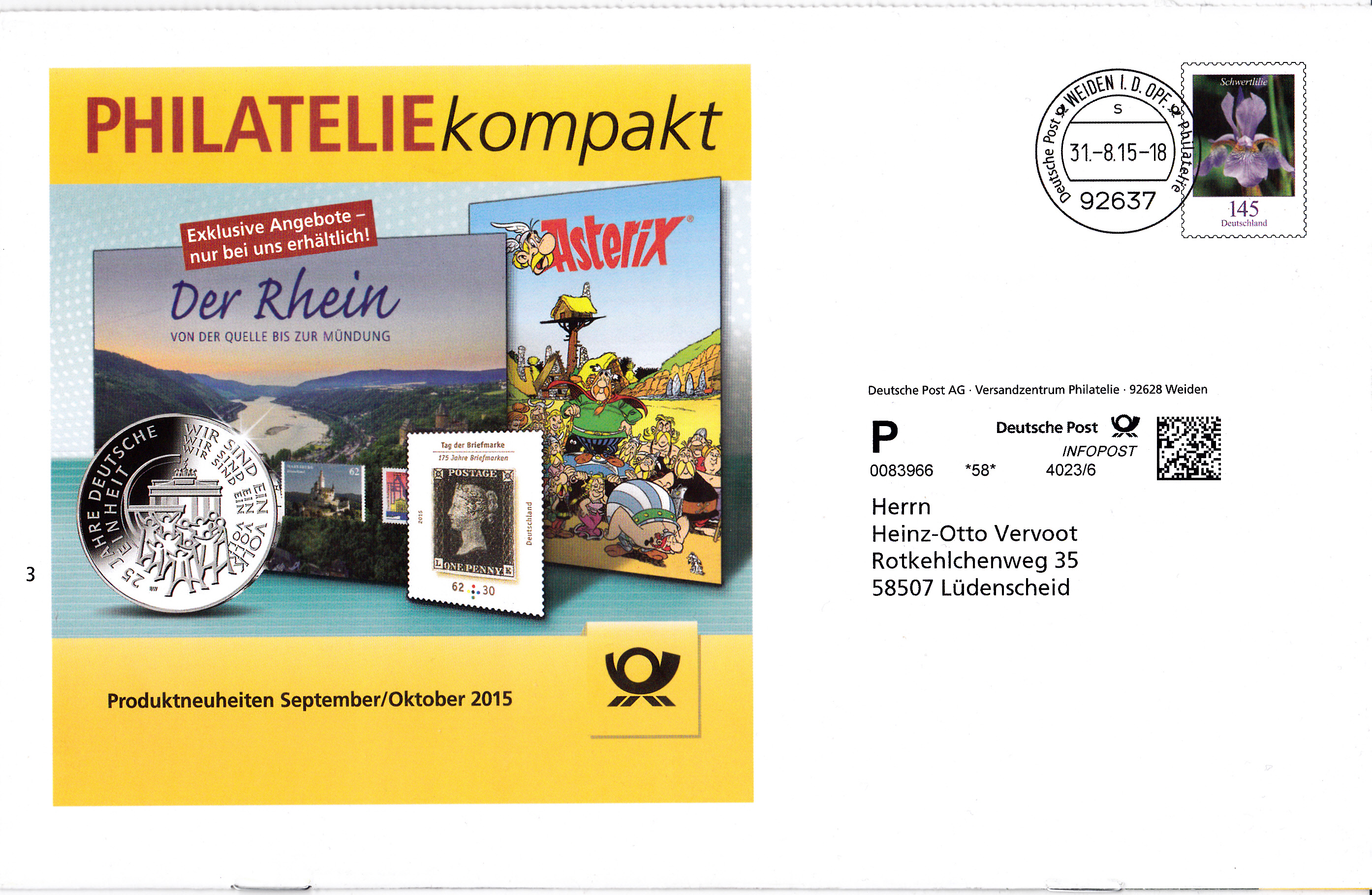 Diese Broschüre im Format 235 x 152 mm (unten geheftet) hat einen Wertstempel mit der 145 Cent Marke "Schwertlilie" aus der Bauerserie "Blumen". Die Vorausentwertung hat das Datum "31.-8.15-18".