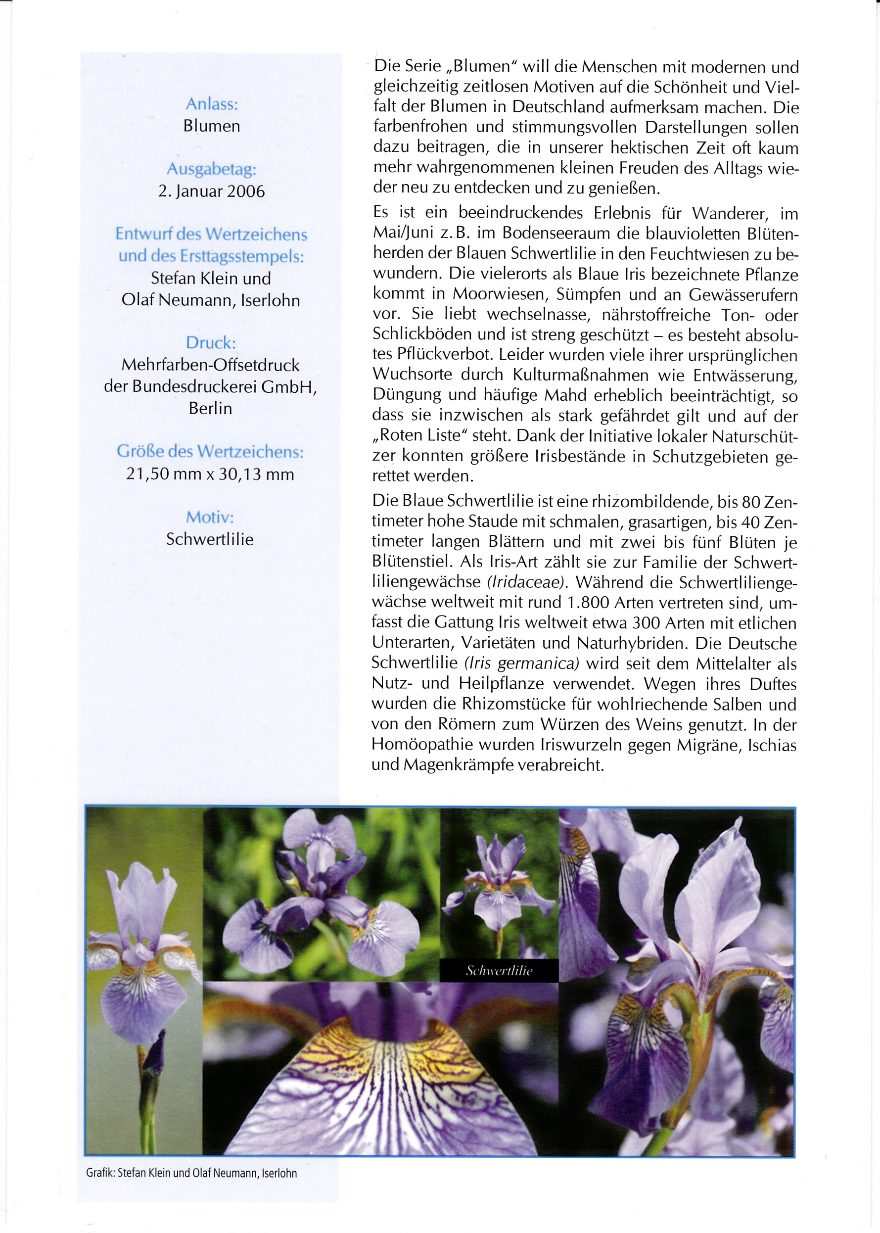 Ersttagsblatt mit der Marke der Dauerserie "Blumen" mit dem Motiv Schwertlilie. Auf der Rückseite der Ersttagsblätter findet man einige Informationen zum Markenmotiv.