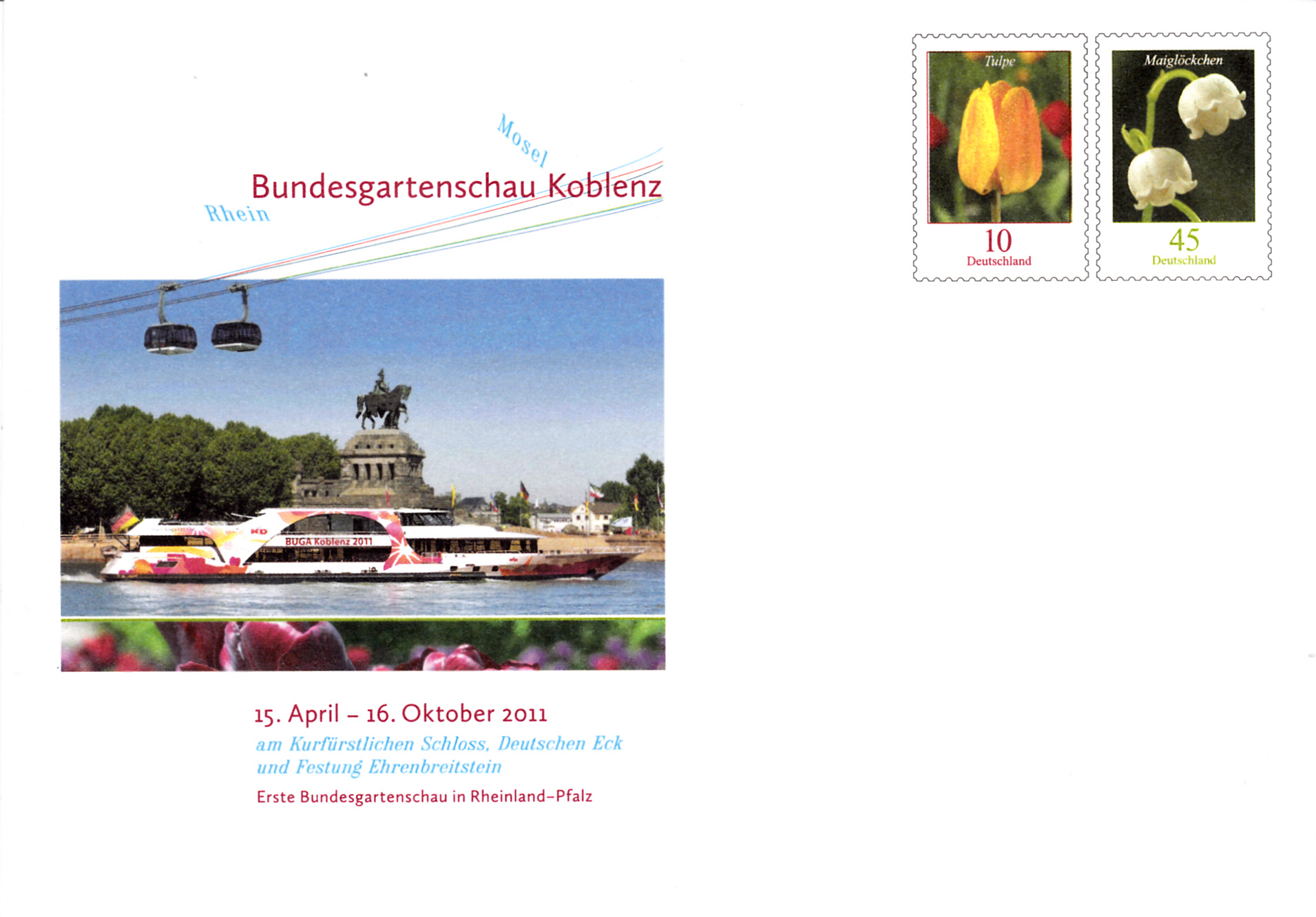 Zur Bundesgartenschau in Koblenz ist dieser Sonderumschlag (MiNr U41) mit den beiden Wertstempel "Tulpe" (MiNr 2484) und "Maiglöckchen" (MiNr 2794) erschienen.