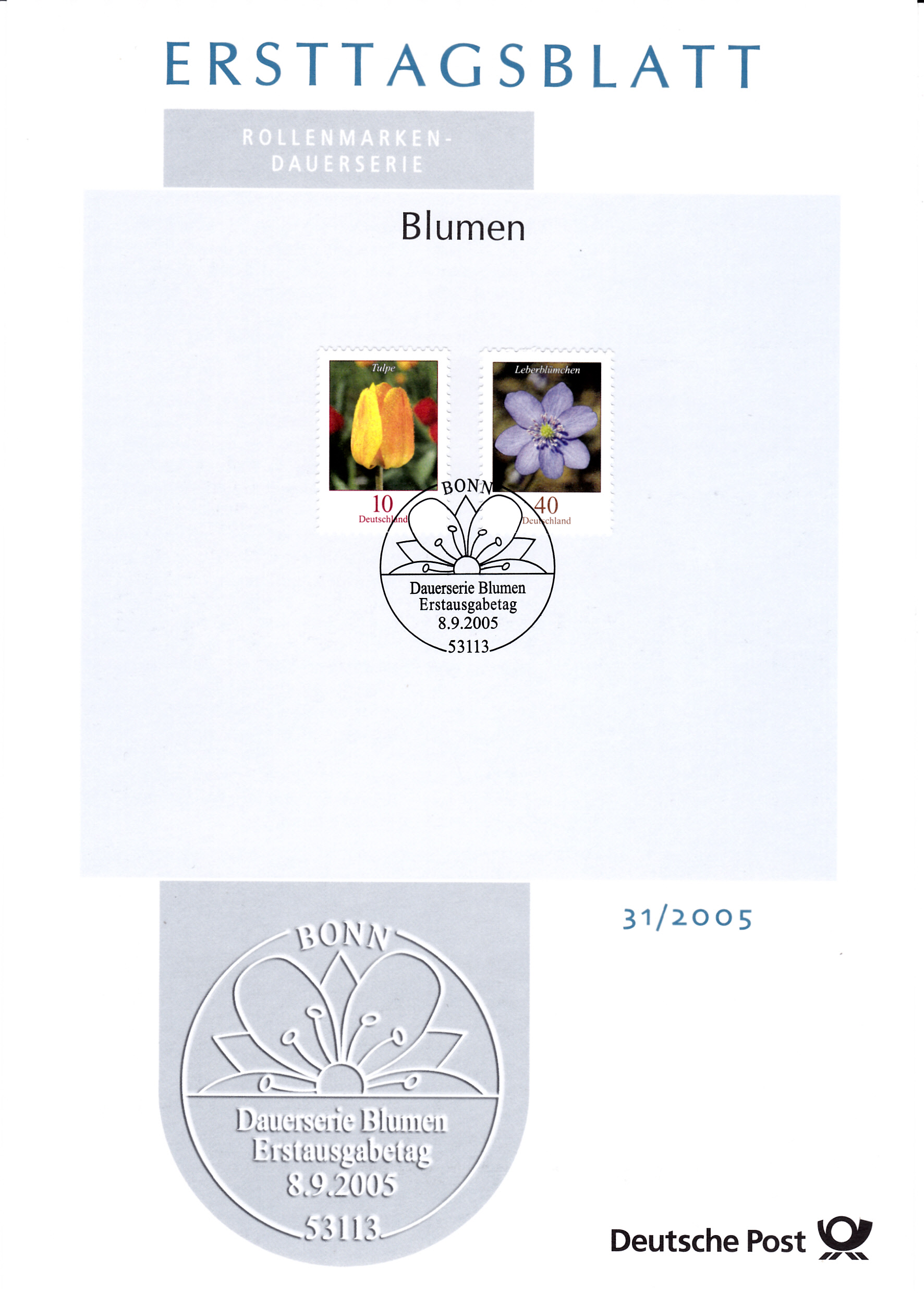 Ersttagsblatt mit den beiden Marken der Dauerserie "Blumen" mit den Motiven Tulpe (Tulipa sp.) und Leberblümchen (Hepatica sp.).
