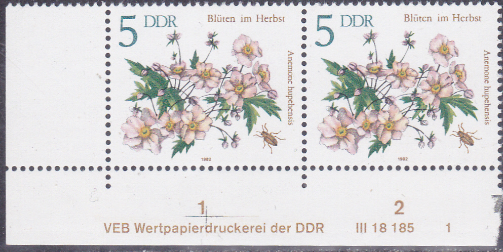 Von der bereits gezeigten Marke der DDR (MiNr 2737) mit Blüten einer Herbst-Anemone (Anemone hupehensis) kann ich hier auch ein Paar vom linken unteren Bogenrand mit Druckvermerk zeigen.