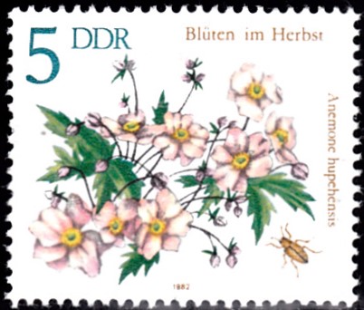 Auf dieser Marke der DDR (MiNr 2737) werden Blüten einer Herbst-Anemone (Anemone hupehensis) gezeigt.