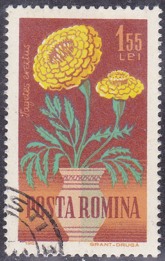 Aus Rumänien kommt diese Marke (MiNr 2275) mit einer Aufrechten Studentenblume (Tagetes erecta). Bei Michel wird als Name Sammetblume (Tagetes patula) angegeben.