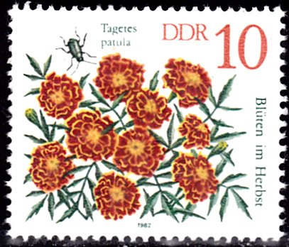 Auch eine Marke aus der DDR (MiNr 2738) bildet Studentenblumen (Tagetes patula) ab.