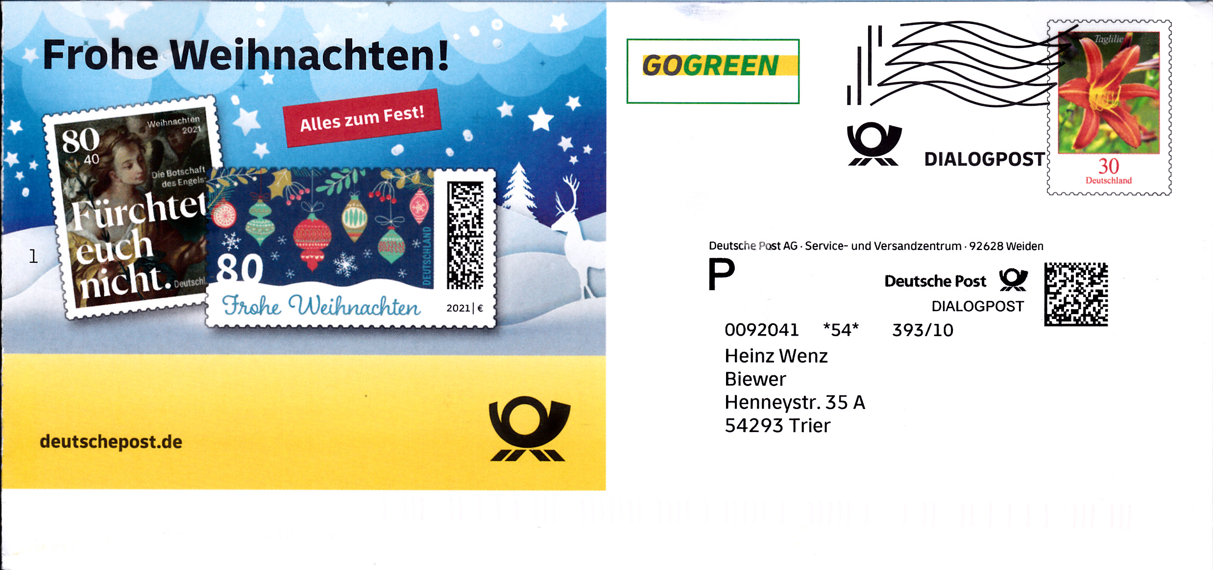 Faltbrief 210 mm x 102 mm mit Wertstempel der 30 Cent-Marke der Dauerserie "Blumen" (MiNr 3509) "Taglilie" mit aufgedruckter Zähnung. Der Wertstempel ist mit einer Welle "Dialogpost" entwertet.