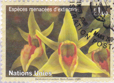 In einer Serie "Gefährdete Arten: Orchideen" erschien bei den Vereinte Nationen Genf diese Marke (MiNr 512) mit einer Dendrobium cruentum.
