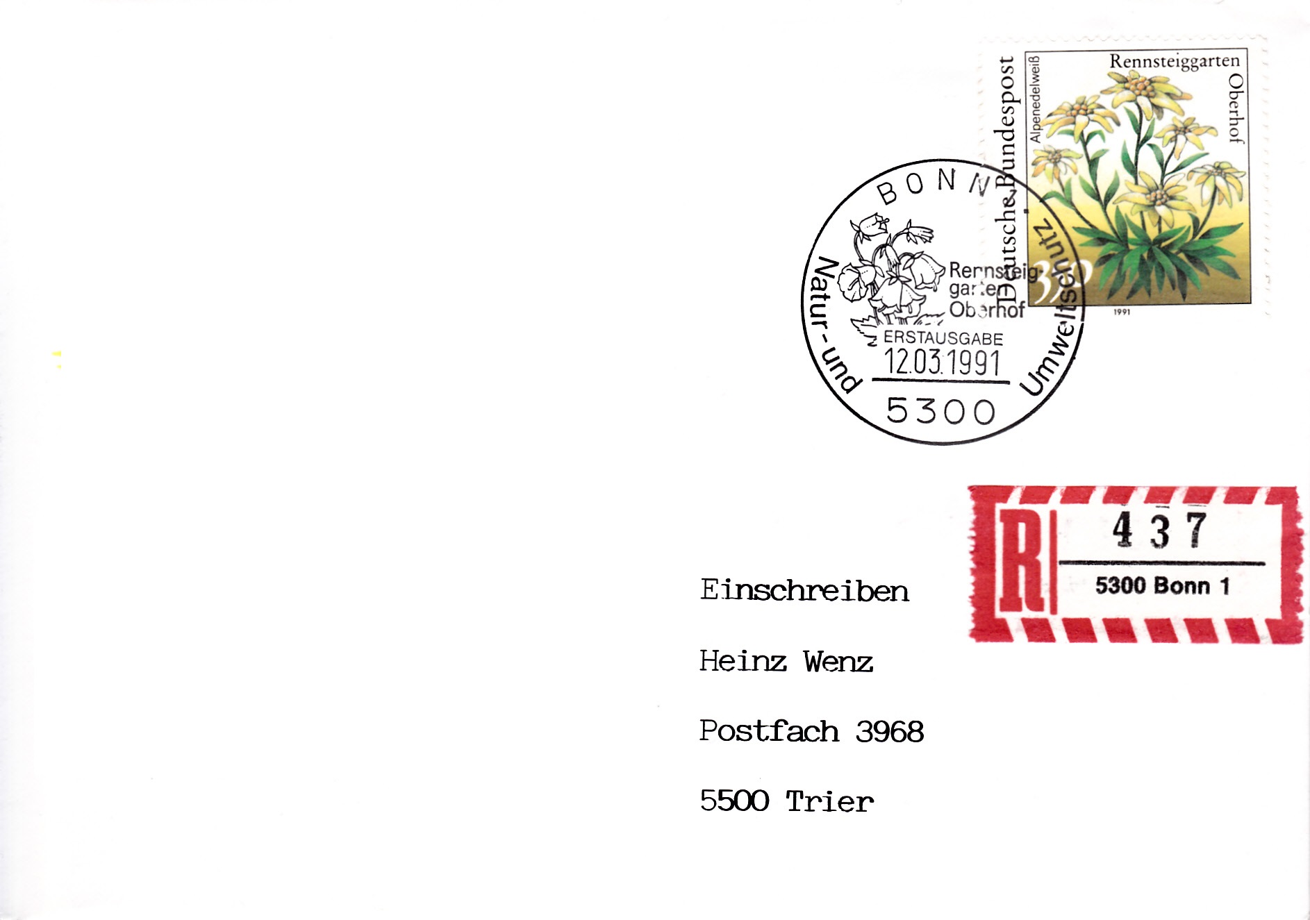 Die bereits gezeigte Marke zu 350Pf (MiNr 1509) aus der Serie "Pflanzen aus dem Rennsteiggarten in Oberhof" (MiNr 1505) mit einem Alpen-Edelweiß (Leontopodium alpinum) wurde auf diesem Brief mit Einschreiben mit dem Ersttagsonderstempel Bonn entwertet.
