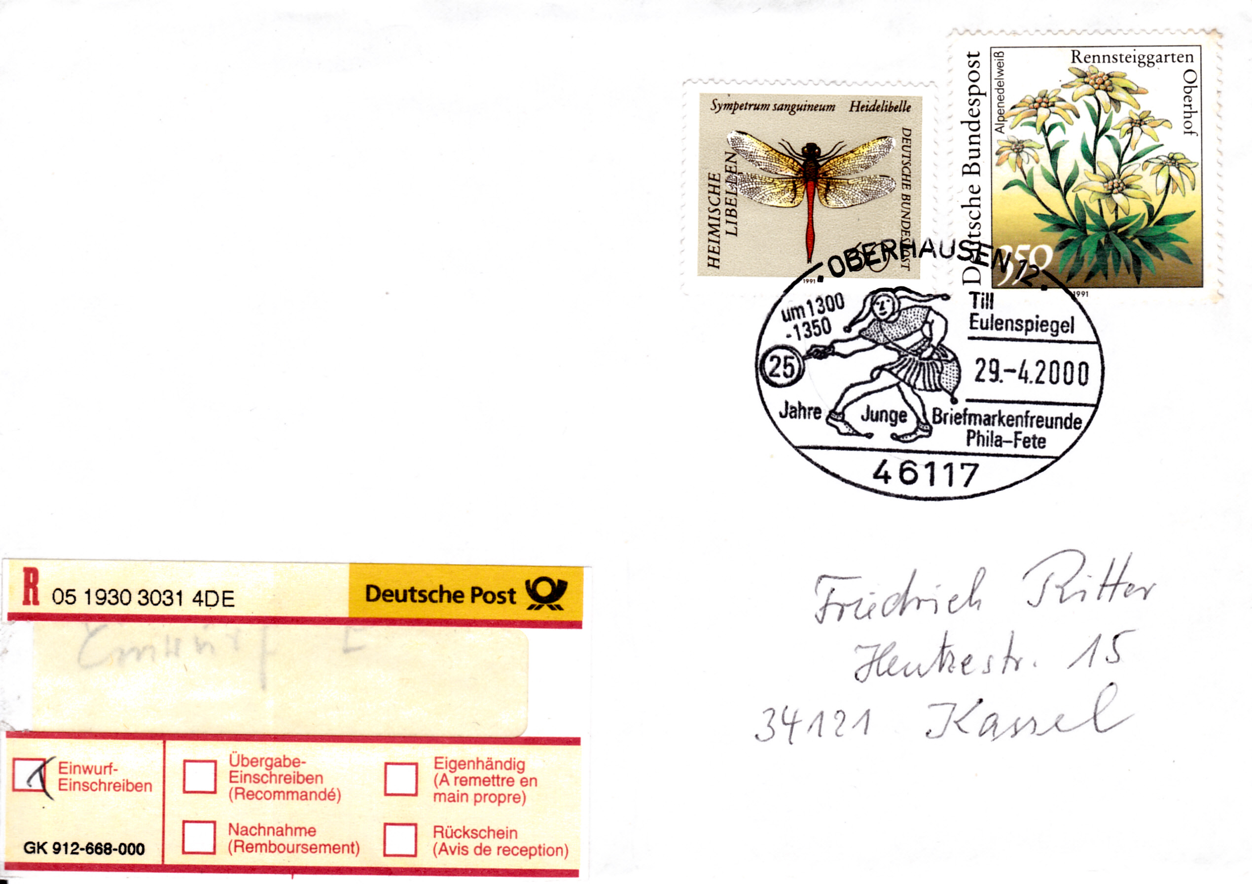 Auf diesem Brief wurde die Marke zu 350Pf (MiNr 1509) aus der Serie "Pflanzen aus dem Rennsteiggarten in Oberhof" (MiNr 1505) mit einem Alpen-Edelweiß (Leontopodium alpinum) erst im Jahre 2000 zur Frankatur eines Einwurf-Einschreiben-Brief verwendet. Das Porto betrug 110Pf (Brief bis 20g) plus 300Pf (Einwurfeinschreiben).