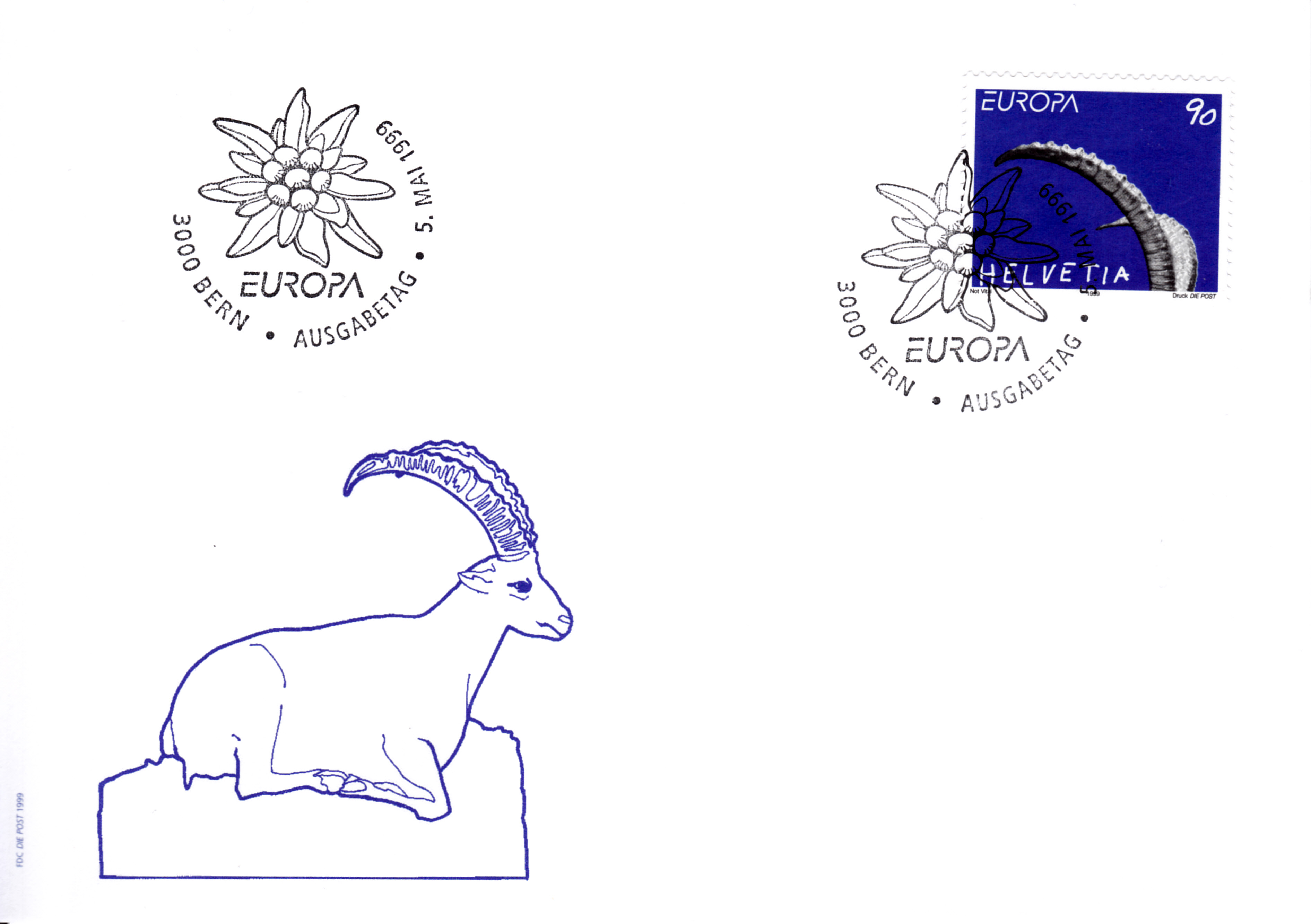 Der Ersttagsonderstempel aus Bern zur Europamarke 1999 aus der Schweiz bildet im Stempel eine Blüte des Alpen-Edelweiß (Leontopodium alpinum) ab.