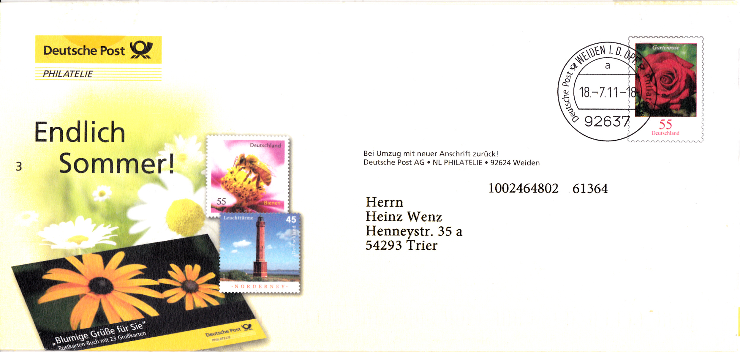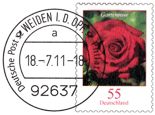 Faltbrief (MiNr EA F551) 210 mm x 100 mm mit Wertstempel der 55C-Marke aus der Dauerserie "Blumen" (MiNr 2669) mit dem Motiv "Gartenrose" aufgedruckter Zähnung und Vorausentwertung "Deutsche Post (Posthorn) WEIDEN I.D.OPF (Posthorn) Privatkunden/Filialen / a / 18.-7.11-18".