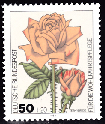 Die Wohlfahrtsmarken der Deutschen Bundespost aus dem Jahre 1981 zeigen Gartenrosen. Hier zeige ich die Marke zu 50+20 Pfennig (MiNr 1150) mit einer Teehybride.