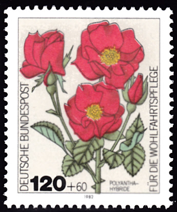 Auch die Wohlfahrtsmarken der Deutschen Bundespost Berlin aus dem Jahre 1981 zeigen Gartenrosen. Hier zeige ich die Marke zu 50+20 Pfennig (MiNr 680) mit einer Floribunda-Grandiflora.