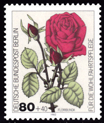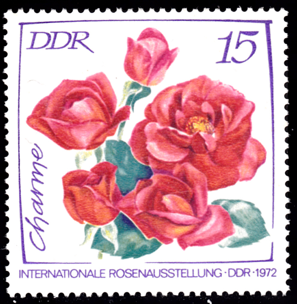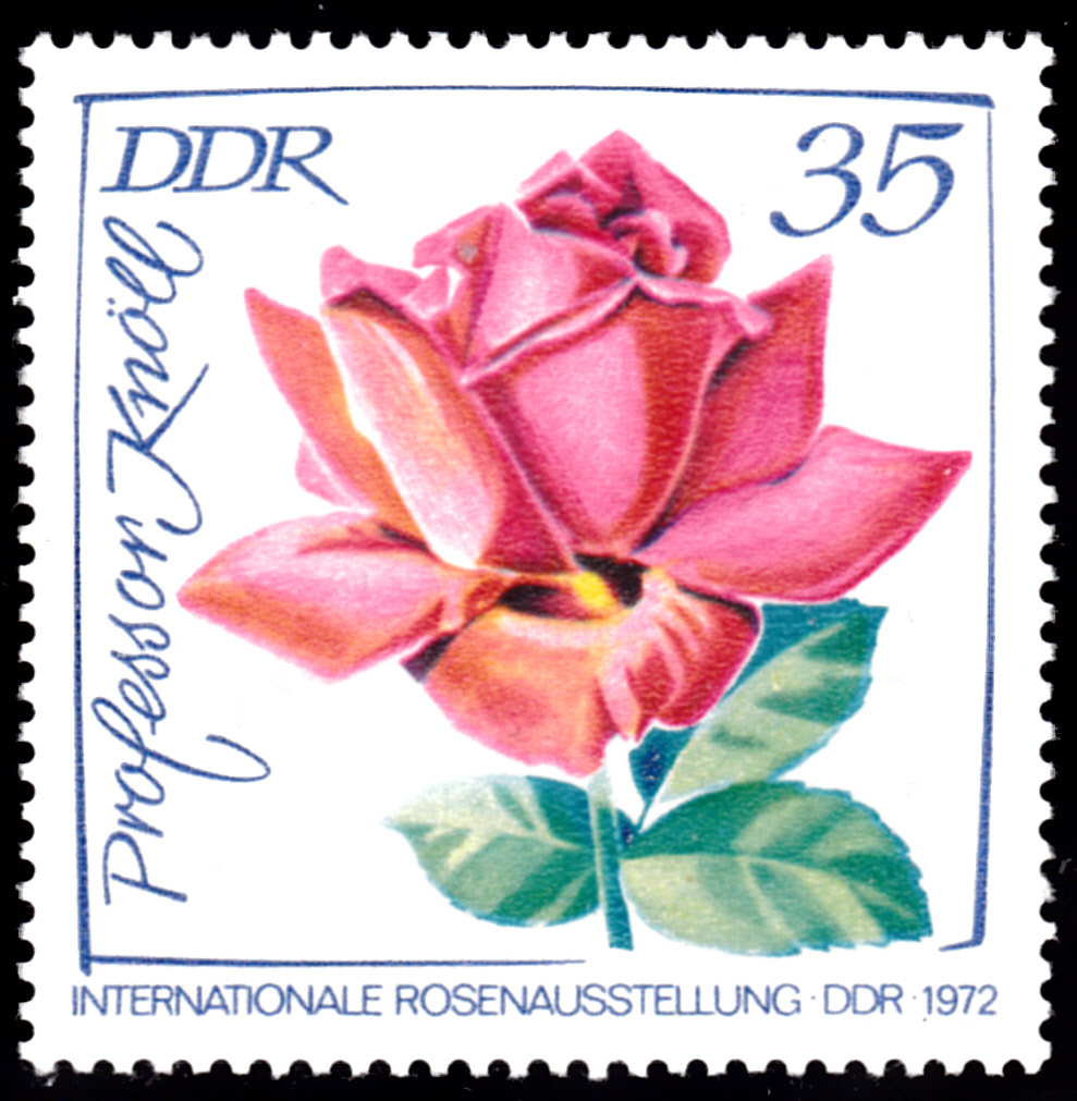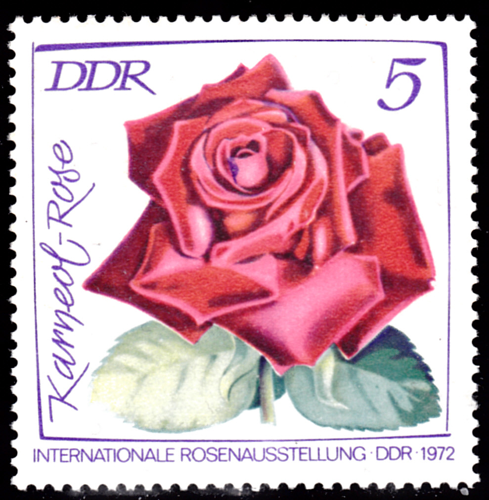 Zur Internationalen Rosenausstellung in Erfurt sind in der DDR in einer Serie Marken mit Rosenabbildungen erschienen. Hier zeige ich die Marke zu 5Pf (MiNr 1763) mit der Teehybride mit dem Namen Karneol-Rose.