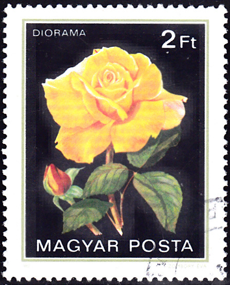 Eine Marke aus Ungarn (MiNr 3550 A) zeigt eine Rose der Zuchtform "Diorama".