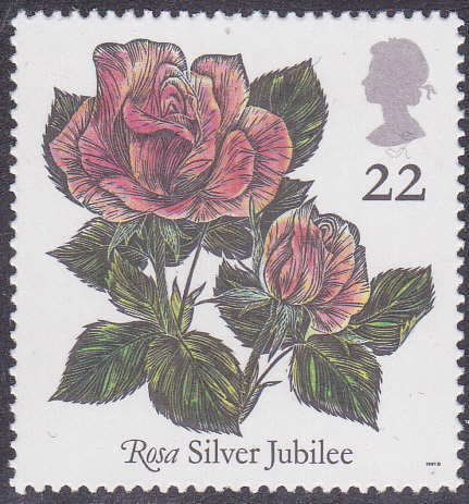 In Gro0ßbritannien erschien in einer Serie "Weltkongress für Rosenzucht in Belfast" 1991 diese Marke (MiNr 1345) mit der Rose "Silver Jubilee".