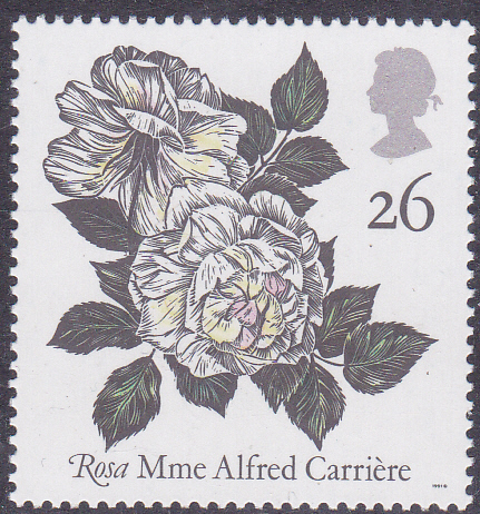 Auf der zweiten Marke der Serie (MiNr 1346) sehen wir die Rose "Mme Alfred Carrière".