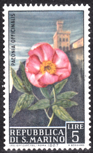Auf dieser Marke aus San Marino wird uns eine Gemeine Pfingstrose (Paeonia officinalis) gezeigt.