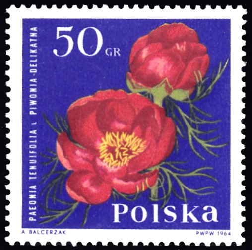 Eine Marke aus Polen (MiNr 1544) bildet eine Feinblättrige Pfingstrose (Paeonia tenuifolia) ab.