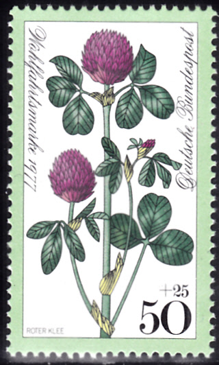 Auf dieser Marke aus der Wohlfahrtsserie 1977 der Deutschen Bundespost (MiNr 951) ist Wiesenklee (Trifolium pratense) zu sehen.