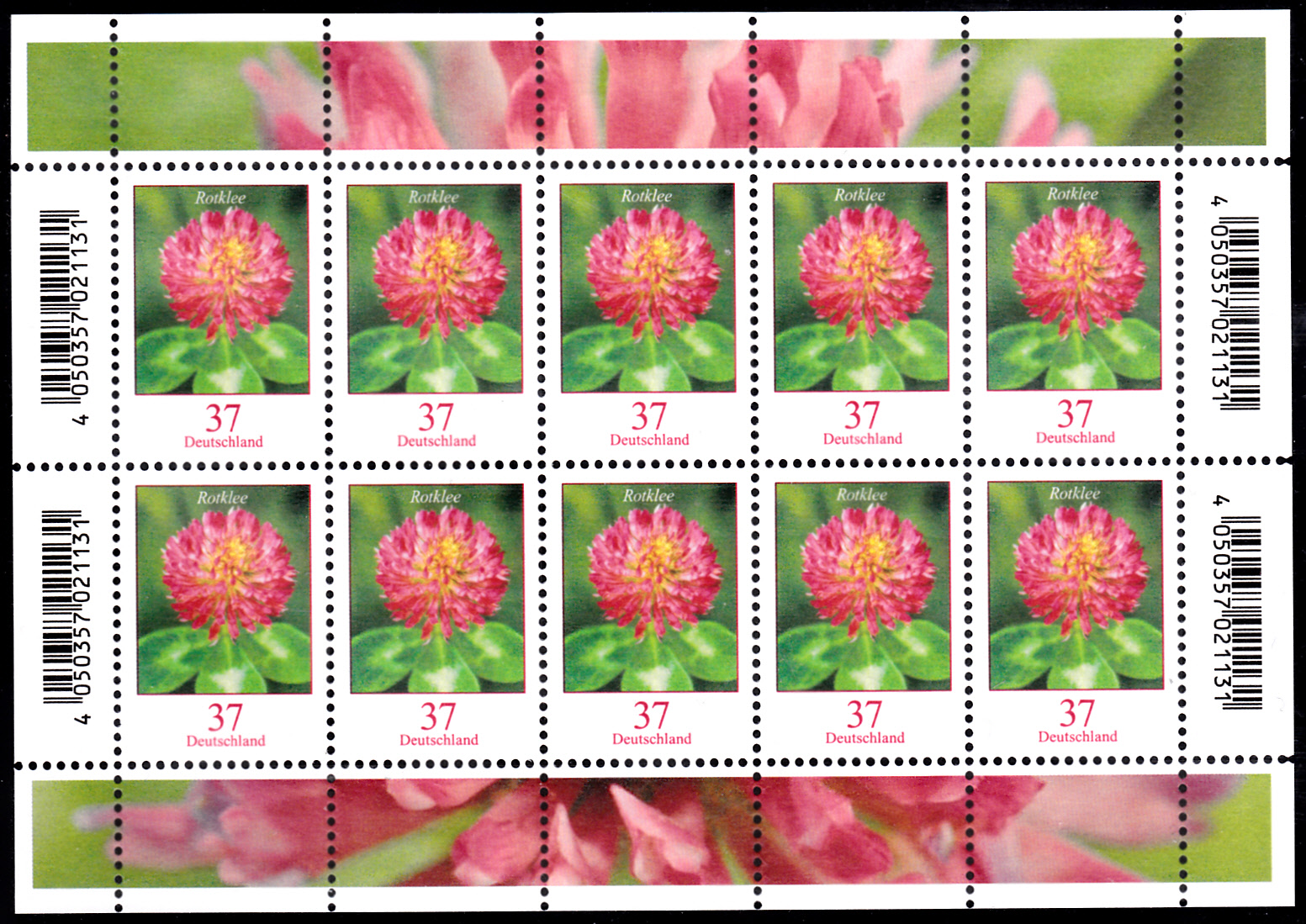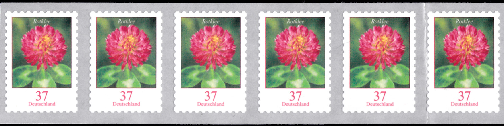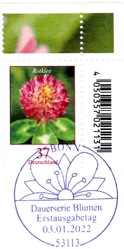 Am 3.2.2022 erschien in der Dauerserie "Blumen" der Deutschen Post die Marke zu 37 Cent (MiNr 3656) mit dem Motiv "Rotklee (Trifolium pratense)"